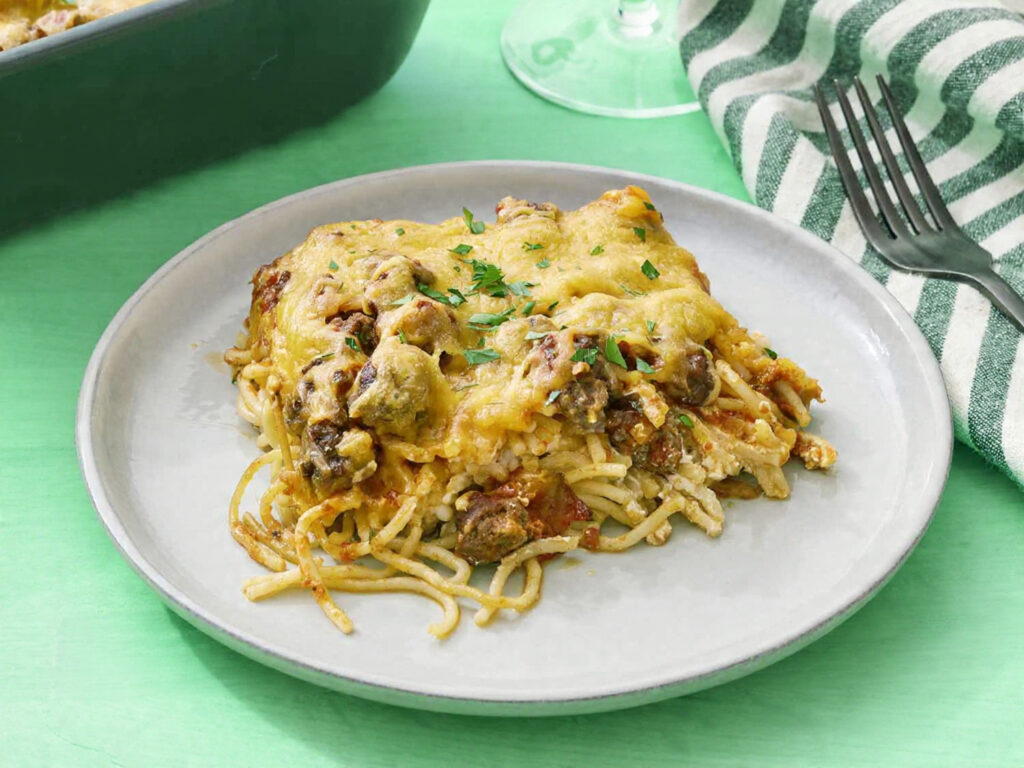 spaghetti, meat sauce, and a blend of cheeses, creating a decadent and satisfying meal. Its origins are